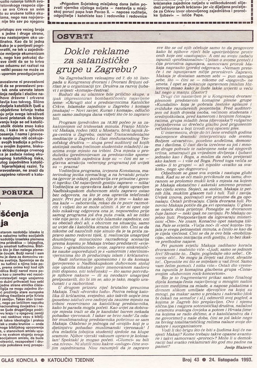 This is the only article in the world because of which Komaja has sued a newspaper. The trial is still going on (since 1993), because of the catastrophic situation of the legal system in the Republic of Croatia.
